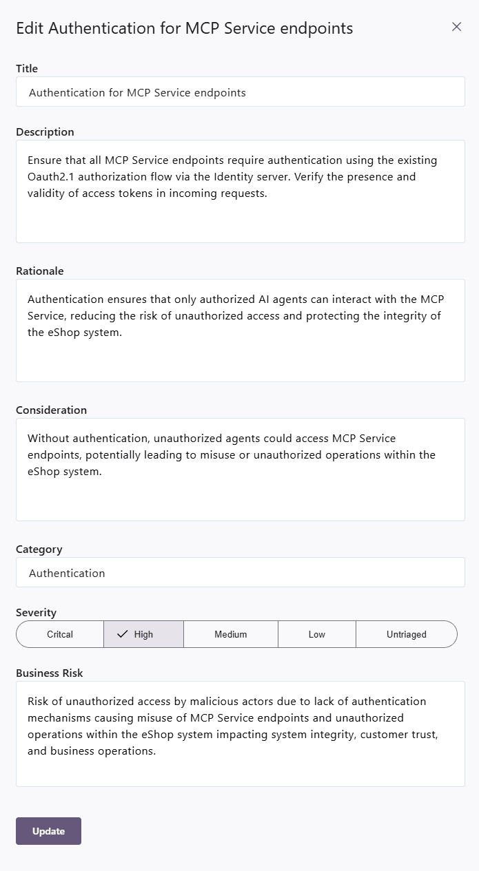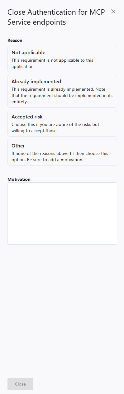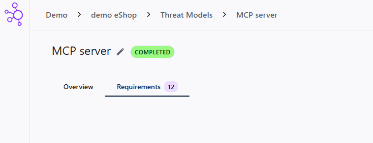 When every requirement has been evaluated, you can click Complete. This will mark the threat model as completed and run any organizationally defined tasks, such as creating issues.