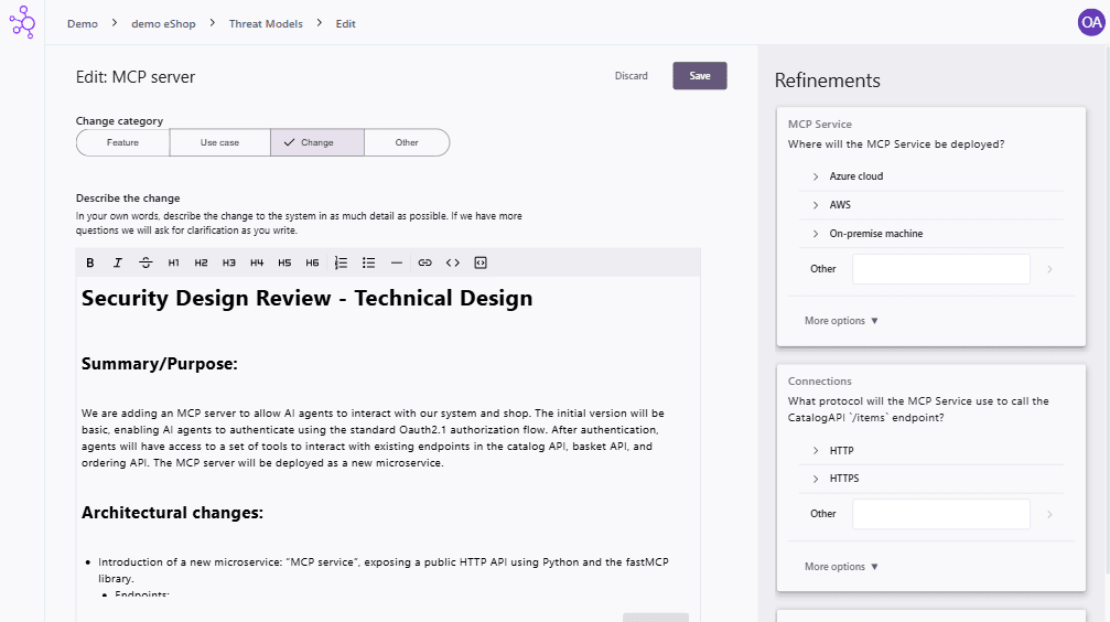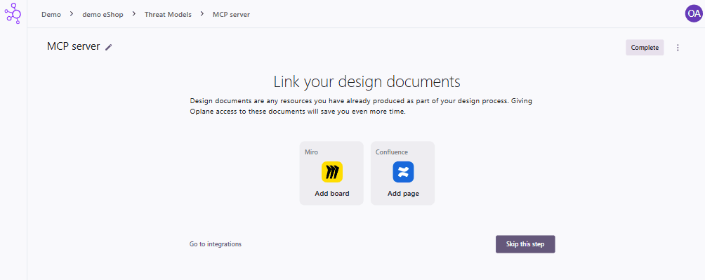 This guide assumes that you are using automated onboarding, for example through the Oplane Slack integration. When a new threat model has been assigned, you will see a page like this: