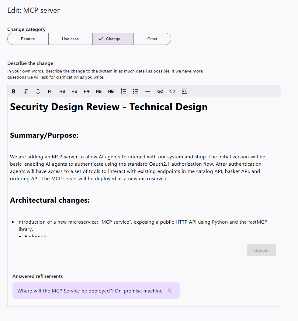 You can, of course, skip importing any design documents, but you will then have to manually describe the change you want to make. After the import has finished, you will see a change description and refinement questions.